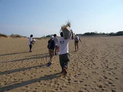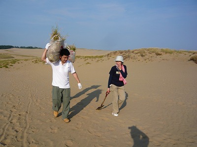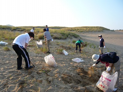 今回の委員会では主に鳥取砂丘イリュージョン実行委員会の各部会の進捗状況の確認、そして今後のスケジュールの確認を行いました。 各部会とも楽しく心が温かくなる様な仕掛けの企画が出来つつあります。 ここからスパートをかけて企画概要を決定し、来月初旬にはイベント概要を広報媒体にのせる予定です。 9月に入り、ハードになっていくのを実感する毎日ですが、 この9月の山場を砂丘委員会! 乗り切ります!! 今年も夏の砂丘ボランティア除草に鳥取JCメンバーと共に参加してまいりました。 午前6時前、日の出前の砂丘に集合です。 そして朝の爽やかな空気の中、開会式が始まります。 担当除草ポイントの長者ヶ浜まで15分程歩いて移動し、今回抜く草の説明を受けた後、実際に草取り開始です。 基本は手で抜きますが、ビロードテンツキなど根の深い草もありスコップも使いながら地道に抜いていきます。 約1時間程の作業でしたが用意したゴミ袋は雑草でいっぱいになり、確実に砂丘の草は減りました。 1回1回の除草は砂丘全体から見ればわずかな面積ですが、この地道な活動を継続することで砂丘の景観が守られていきます! 現在の鳥取砂丘は海からの砂の供給が減少するなど様々な条件が重なる事で、砂の動きが緩慢になり、人の手を加えないと草原化の一途を辿ってしまいます。 毎年行われる市民ボランティアの地道な除草活動により鳥取砂丘はかつての輝きを取り戻してきました。 これからも訪れる県内外の皆様に感動して頂ける風景となるようこの地道な活動はとても大切な意味を持っています。 来年の夏も多くのメンバーに声を掛けて参加したいと思います。 田中 | 次のページ>> | カレンダー